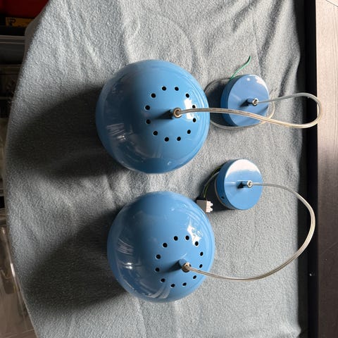 To pene Frandsen kulelamper med få bruksmerker selges fortrinnsvis samlet for 400 eller 200 kr. stk. Ø:18