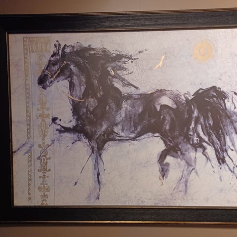 Maleri med dekorativ ramme, Rammen er utsmykket med detaljer i gullfarge. Passer til veggdekorasjon i hjem eller kontor.