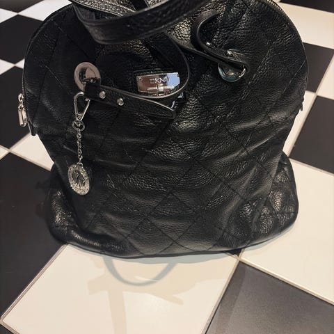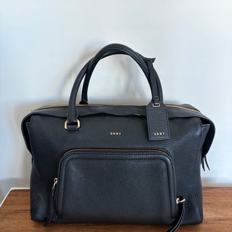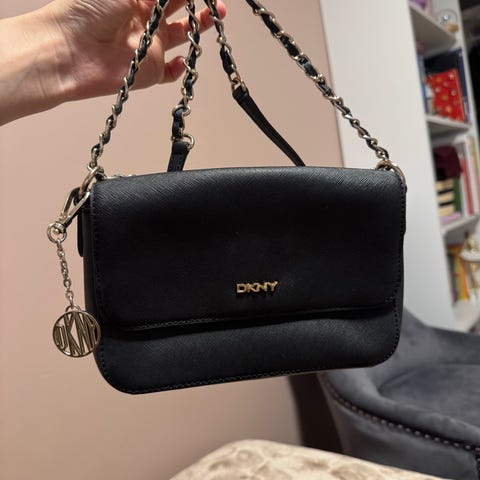 DKNY skinnveske for dame i svart farge. Vesken er laget av lær og har flere innvendige lommer, inkludert glidelåslommer og åpne lommer for organisering. Utstyrt med både kort og lang skulderstropp for fleksibel bruk. Vesken har metallbeslag og en dekorativ DKNY-logo i metall. Kjøpt for noen år siden på Steen& Strøm for 3.800. Lengde ca 26-27 cm, bredde nederst 34 sm