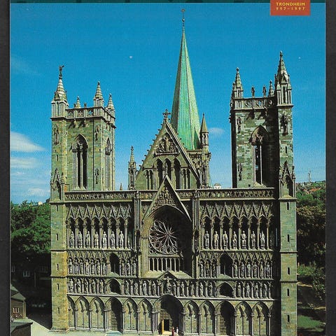 Postkort med motiv av Nidarosdomen i Trondheim en vinterdag. Nidarosdomen er Norges mest sentrale kirke, p.g.a at den er Olav den helliges gravkirke. Tilhører Nidaros bispedømme. Strøkent, ubrukt storformat, se bilder