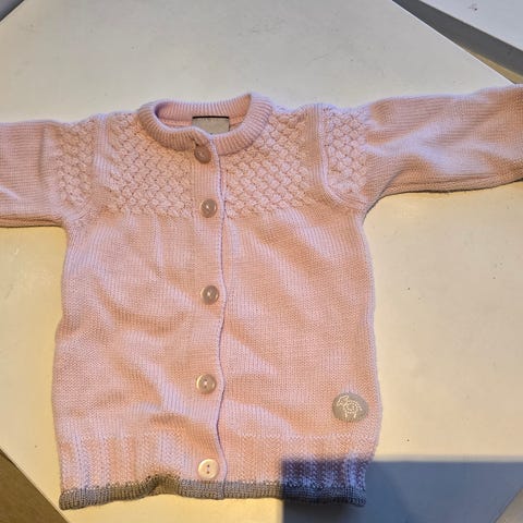 Hvit med lys rosa kanter. Strikket uten sømmer, med knapper og søte detaljer. 100 % merinoull. Veldig myk og god ♡