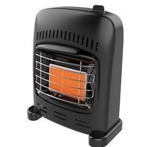 gassovn i hvit farge. Bærbar varmeovn med hjul for enkel flytting. Egnet for oppvarming av mindre rom eller områder uten fast oppvarming. Driftes på gass og har sikkerhetsgitter foran varmeelementet.