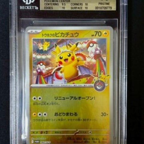 Selger denne spesielle TopSun Pikachu fra 1995. Denne er i prism holo og i usedvanlig god stand i forhold til andre kopier jeg har sett. Dette er en av de aller første Pikachu kortene som er laget og denne er over 30 år gammel. Et sjeldent eksemplar og svært få er gradert.