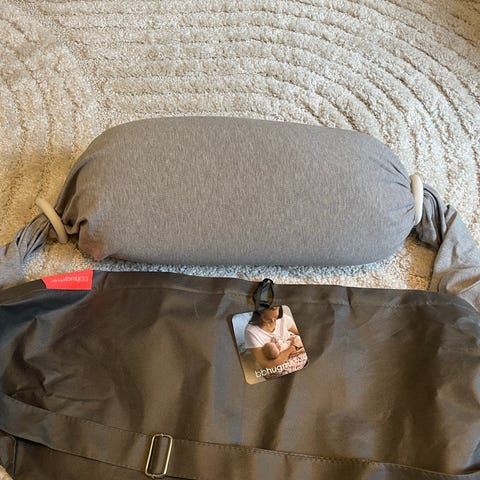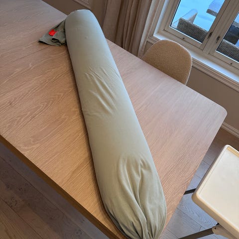 Pent brukt i ca 2 mnd. Veldig god å bruke og lett å ta med rundt. Praktisk å kunne knyte pølsen bak ryggen når man ammer. Håndtaket på bagen er ødelagt, men fungerer med sikkerhetsnålen som vist på bildet. Ekstra trekk følger med.