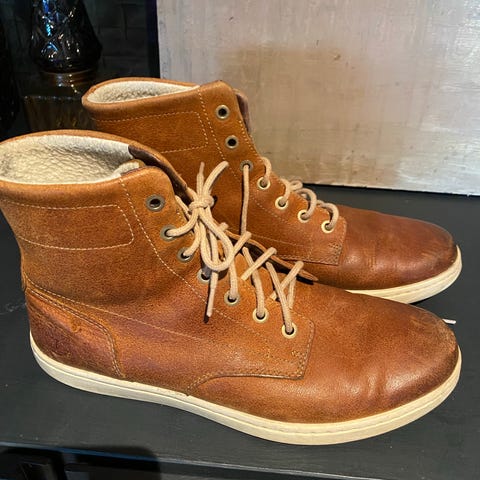 Fra nettsiden: Modellen er utført i kraftig nubuck skinn med et klassisk design og solid randsydd såle for optimal komfort og levetid.