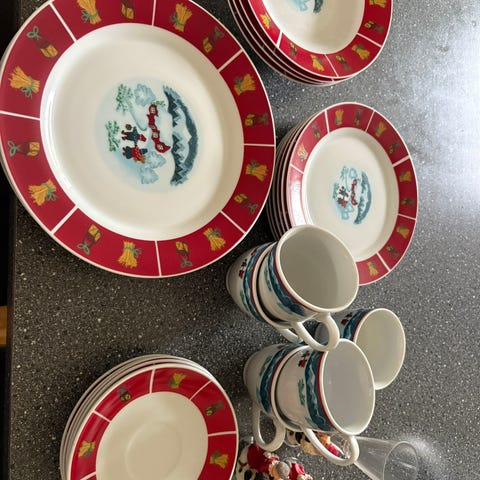 Juleservice med kaffekopper og tallerkner med vintermotiv selges. Koppen har et mønster som viser et hus og måne på en mørk blå bakgrunn med stjerner. Tallerkenen har tilsvarende dekor rundt kanten.