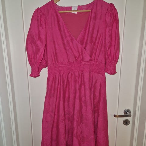 Cerise/rosa Chiara Forthi kjole størrelse XL. Kjolen har elastisk, rynket overdel og puffede ermer. Kan også brukes som off shoulder. Faller tungt og fint, god vidde i skjørtet. Kun prøvd på, lappen tatt av.