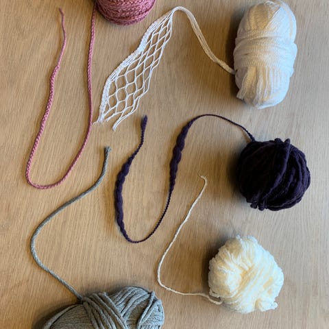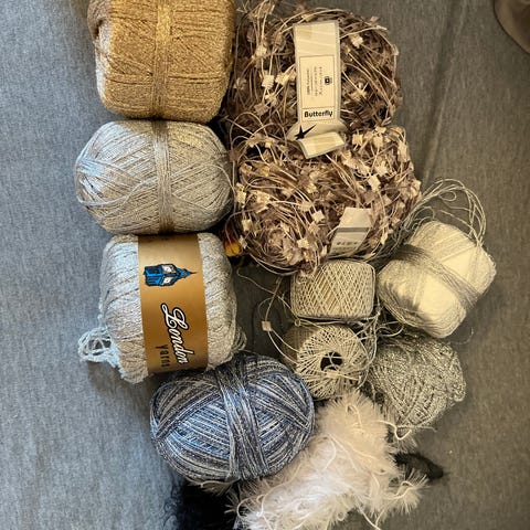 Pakke med garn fra flere forskjellige merker i ulike farger og materialer. Inkluderer rosa, hvit, svart, grå og beige garn i varierende tykkelser og teksturer. Egnet for strikking og hekling av klær, tilbehør og dekorative prosjekter.