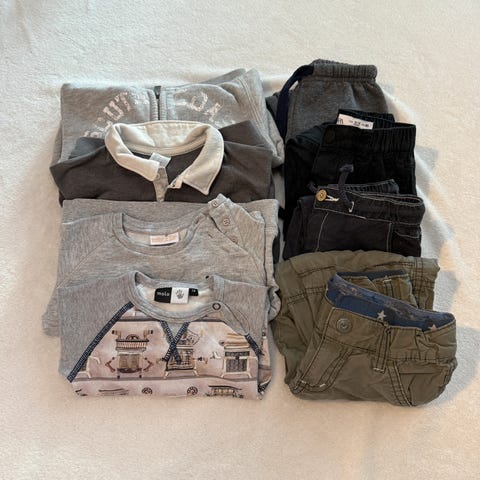 Selger en klespakke til gutt med klær i str 110-116. Ingen flekker, minimalt med slitasje. Det er kun en bukse som har synlig slitasje.
