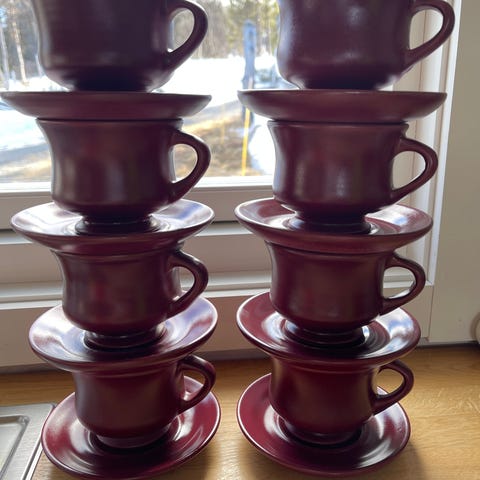Burgunder suppeterrin fra norske Lannem keramikk i Østfold, kjøpt 1981 og svært lite brukt, fremstår som veldig pen.