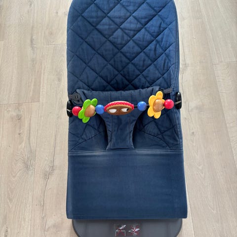 Babybjörn vippestol i blått stoffmateriale. En av stroppene til stoffmatriaet mangler, men det har ingen funksjonell betydning.