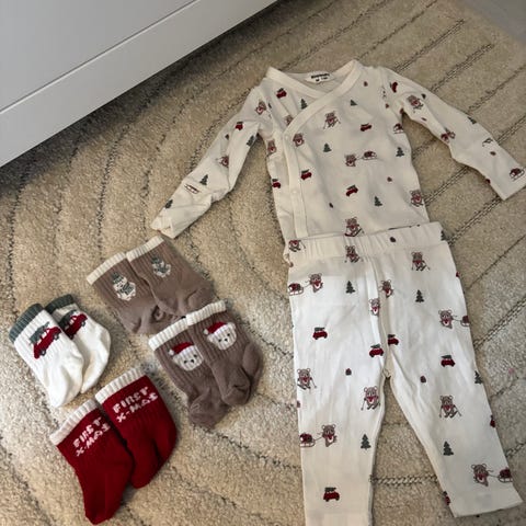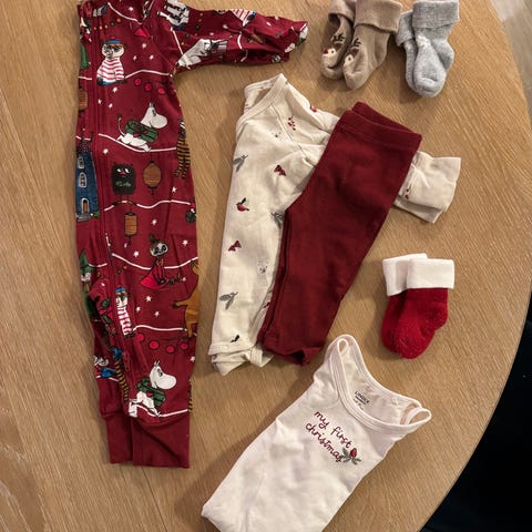 Liten juleklespakke i str. 56. Pysjene er fra Nameit også er det sokker, genser og en heldress fra Newbie. De to andre heldressene er fra Cubus.