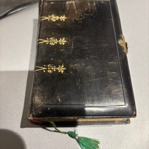 Samtidig brunt fåreskinnsbind over pappdekler med sølvbeslag. Siselert gullsnitt. Kraftig rokokkobind i såkalt bondeutførelse.