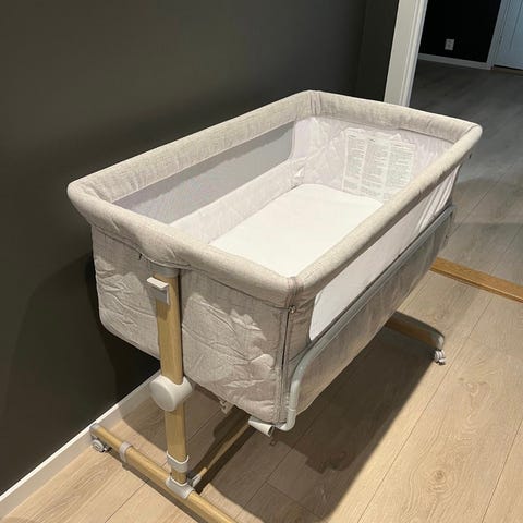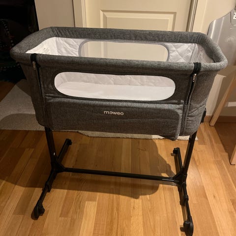 «Fin, praktisk bedside crib fra Moweo med en myk, polstret madrass og oppbevaringsveske.
