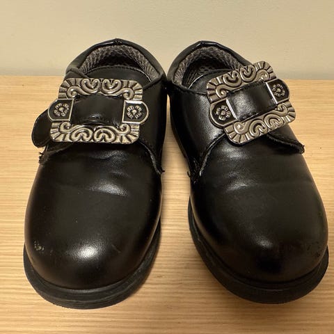 Pent brukte bunadssko / pensko , kan brukes av begge kjønn. Litt bruksmerker, men fremstår pene. Mykt materiale og virker behagelige. Borrelås-lukking