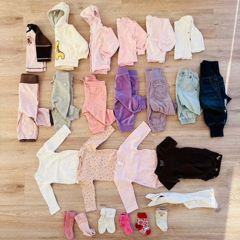 Klespakke til jente i str. 68 (en bukse i str. 74). Alle plaggene er ubrukte. Pakken inneholder: