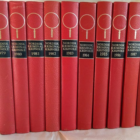 Nordisk Kriminalkrønike bokserie, innbundet i rød farge, inneholder bindene fra årene 1973, 1974, 1977 og 1987. Serien dokumenterer kriminalsaker fra Norden og er designet for samlere og lesere interessert i nordisk kriminalhistorie. Må hentes