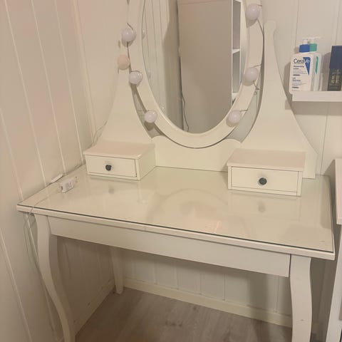 Praktisk speil med både skuffer og bord. Speilet har også en lampe, men som du ser på bilde så er den ene lille biten på lampen knust. Altså bare den ene lille glass "pynte" biten nederst om du ser på bilde. Kan brukes med og uten bein. Selges rimelig pga renovering hjemme. Førstemann til mølla. Se gjerne flere annonser jeg har ute. Ville gitt dette ett strøk maling foresten!