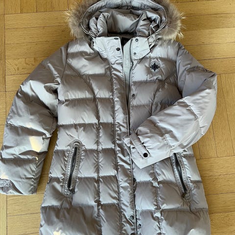 Jakken har hette og er polstret for ekstra varme. Den har lommer foran og glidelås i front. Materialet er designet for å gi isolasjon og komfort i kaldt vær.