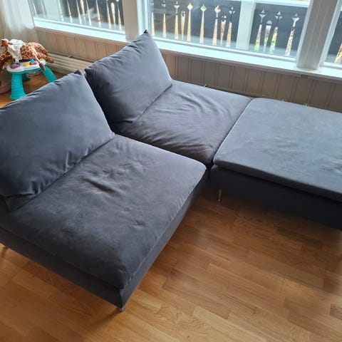 Modell 4-seter sofa. Er i to deler, så kan brukes som en lang sofa og som to deler. Delene festes sammen med skjulte fester.