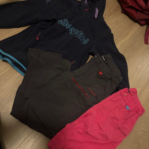 Selger en høst/vår pakke som består av Bergans-bukse og Bergans softshell jakke, perfekt for kjølige høst og vårdager. Klærne er godt brukte, og buksen har noen små hull (se bilde). Hullene påvirker ikke funksjonen, og settet kan brukes lenge til.