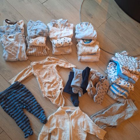 Liten klespakke str 50-56. Består av 2 body ( brukt 2 ganger) fra Lindex, 4 pisj fra Carters og en ull overall, desverre ble den casket ved 60 grader slik at den har krympet litt ( var cca str 62-68 nå passer til 50-56) . 2 luer følger med ( vasket men ikke brukt)