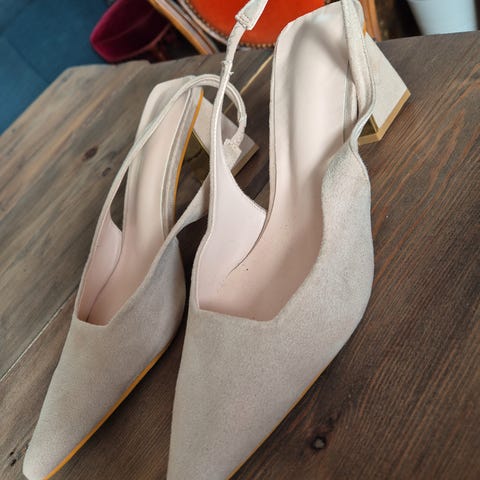 H&M hæler i størrelse 38, beige farge. Skoene har en spiss tå og åpen hælkappe med stropp. Materialet ser ut til å være syntetisk. Hælene er smale og moderate i høyde. Skoene er nye med original merkelapp festet.