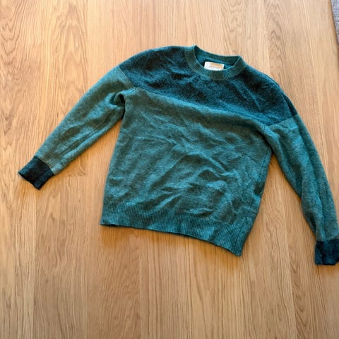 Genser fra Holzweiler str small. Oppleves som litt romslig i str. Finner ingen vaskeanvisning-lapp i denne, men det føles som en bomullsmix. Den er ca 52 cm bred, og ca 58 cm lang forann, og ca 63 cm lang bak. Liten splitt i siden, og litt lengre bak. Strikket i halvpatent, så det er god stretch. Ingen skader eller anmerkninger, men man kan se at den er brukt og vasket en håndfull ganger. Kan sendes med PostNord for 69 kroner ved forskuddsbetaling/vipps.