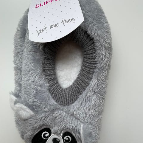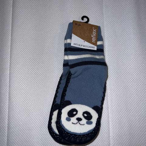 Helt nye barne tøfler i mørkeblå med hvitt mønster og bjørnemotiv. Tøflene har antiskli såle. Ny pris: 129 kr