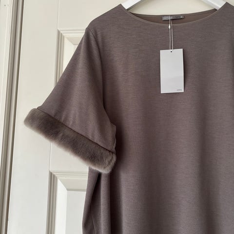 Pent brukt og fin kjole i bomull selges. Strikk i overdel som gir fin passform, strikk på ermer og en splitt . Ingen feil eller mangler.