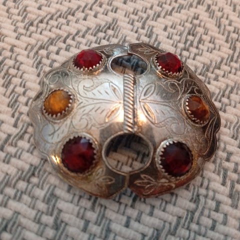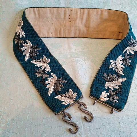 Ullbrodert belte fra 1902, med perleinnslag. Brodert årstall og to initialer. Påskjøta mindre del. Livvidde: 88 cm. Foret med mønstrete lakkstoff/regnstoff. Kan sendes.
