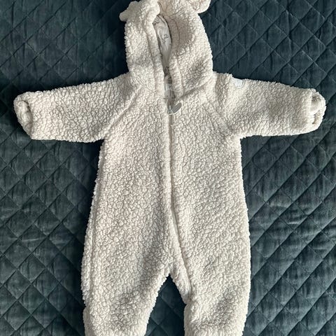 Newbie parkdress i størrelse 56. Oppleves stor i størrelsen. Heldressen er laget av mykt og varmt materiale, med hette og glidelås foran. Den har et fôr med mønster innvendig for ekstra komfort. Kun brukt et par ganger🌸