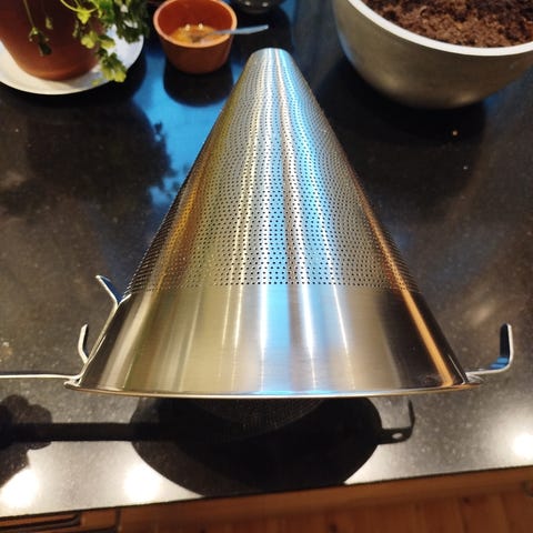 Spissil i rustfritt stål. Diameter 18,5 cm.