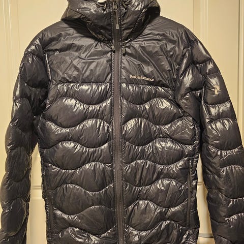 Peak Performance lett dunjakke størrelse M selges. Jakken har strikk i hetten og to ytterlommer.