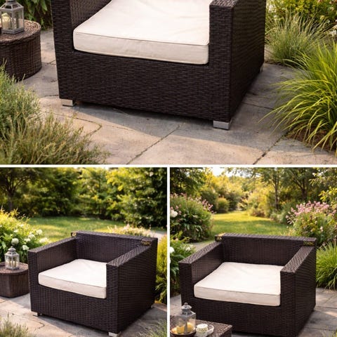 Svart hage stol laget av flettet materiale med metallramme. Stolen har armlener og er designet for utendørs bruk. Passer for bruk i hage eller på terrasse..