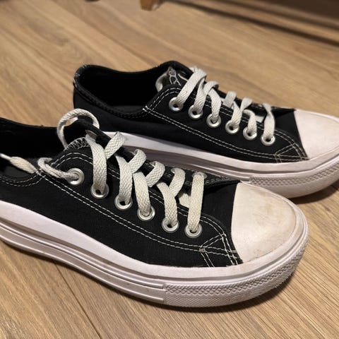 Skoene er hvite med snøring og har en flat såle. Egnet for hverdagsbruk. Vasket og klar for ny eier.