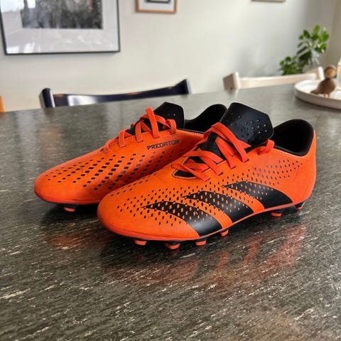 Adidas Predator Accuracy 4 fotballsko i størrelse 38. Skoene er oransje med svarte detaljer og har en design som gir presisjon og kontroll på banen. Materialet er syntetisk, og skoene er beregnet for bruk på fotballbaner.