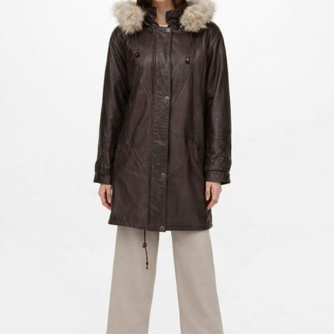 Yttersiden er laget av mykt skinn i en varm, cognac brun farge med en mørkere brun, stor pelskrage. Hele jakken er foret i polyamid. Tøffe sømmer i foret. 2 ytterlommer. Kan brukes med belte. Jeg har ikke belte på det. Størrelsen er 40 men kan brukes fra 36.(S-M) FRA 1200kr TIL 1080