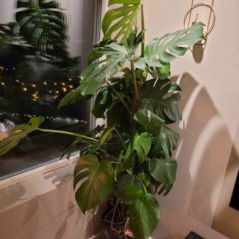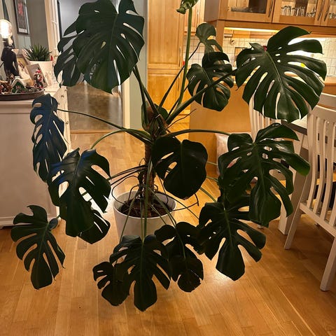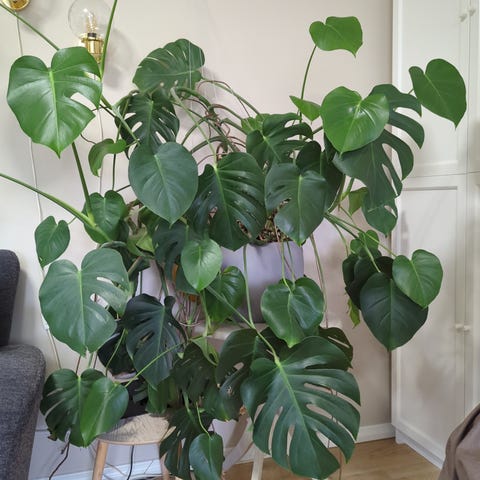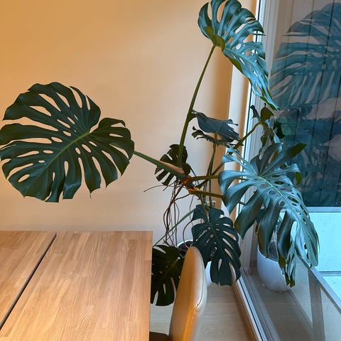 Monstera Deliciosa stueplante med store, grønne blader. Bladene er ca 1×1 m. Vokser som eit uvær - plantet den om i fjor, då denne bestod av toppstikling med 5 blad. Har måtte klippe av fleire blad pga tar stor plass, og noen har blitt ødelagt av små barnehender.