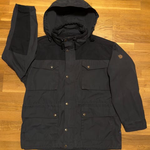 Fjällräven G-1000 jakke i størrelse M med flerfarget design. Jakken er laget av slitesterkt G-1000 materiale, egnet for utendørs bruk. Den har hette og flere lommer for praktisk oppbevaring. Passer for menn og er designet for allsidig bruk i variert vær.