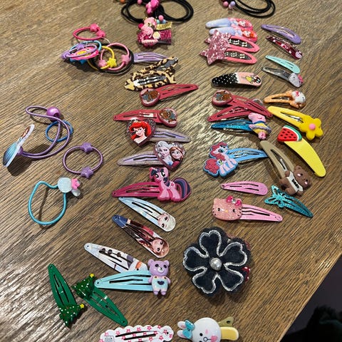 Pent brukte smykker og hårpynt. Inkludert solbriller og små bamser med godlukt.