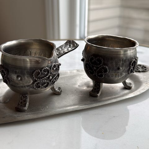 Selger to koselige sparebøsser i metall, silver plated finish.