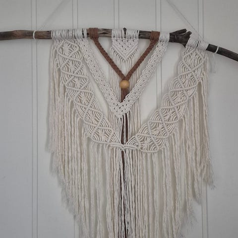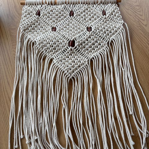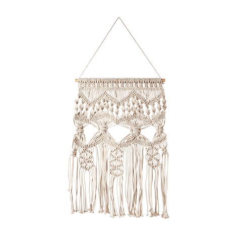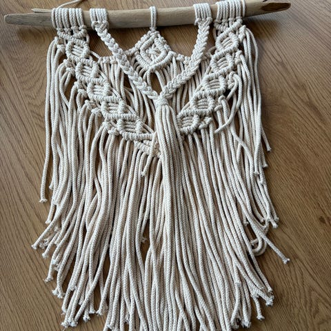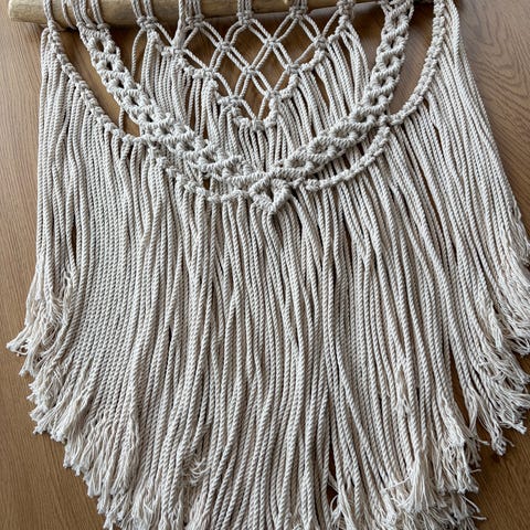 Flott Makramè med frynser fra House Doctor, natur farge. Oppheng i metall. Noe gul på toppen i tekstil, mulig det går bort i vask.