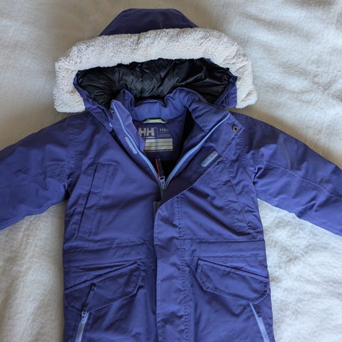 Gul Vår/sommerjakke, tynn dunjakke, swix skijakke, stormberg regnjakke, HHregnjakke og ei regnbukse 110/116. Lue 55/57. Litt ullsokker og trøyer kan følge med om ønskelig.