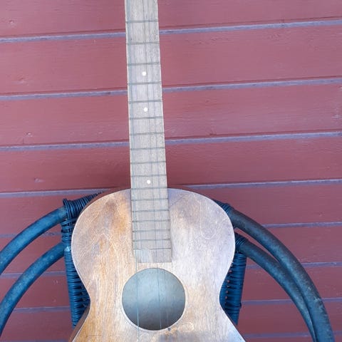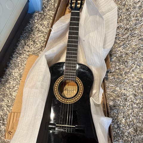 Disney Hannah Montana akustisk gitar i lilla farge. Gitaren har dekorative motiver på forsiden og er designet for barn eller tenåringer. Den har seks strenger, en standard gitarhals og stemmeskruer i metall. Trenger bare én ny streng. Disney Hannah Montana akustisk gitar laget av Washburn. Denne 3/4-størrelse ca. 36 x 13 inches gitaren var en del av en serie musikkinstrumenter inspirert av Disney Channel-serien Hannah Montana, med Miley Cyrus i hovedrollen.