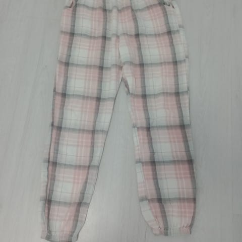 Flerfarget, stripet pysjbukse i str M fra H & M. Lommer, både knapper og knyting i midjen. Knapper på leggen som hemper kan festes om man ønsker å brette opp buksa.