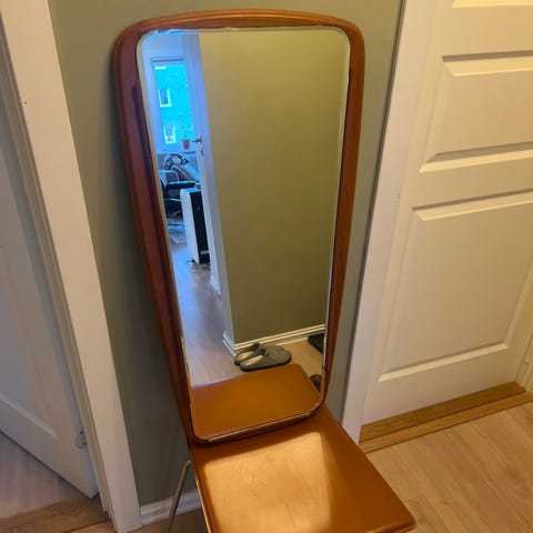 Speilet er kult, helt og fint, lysene virker. Høyde 87 cm og bredde 40 cm på det bredeste.