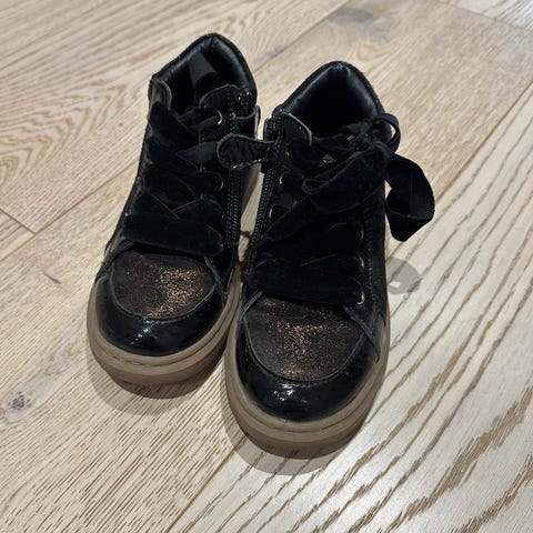Rakk ikke å bruke disse mer enn 2-3 ganger, før de ble for små. Bare til fint bruk, ikke skole. Derfor er de svært pent brukt. Kan skimte antydning til at de har vært brukt framme på tåen (se bilde), ellers er det ingen merker eller skader.