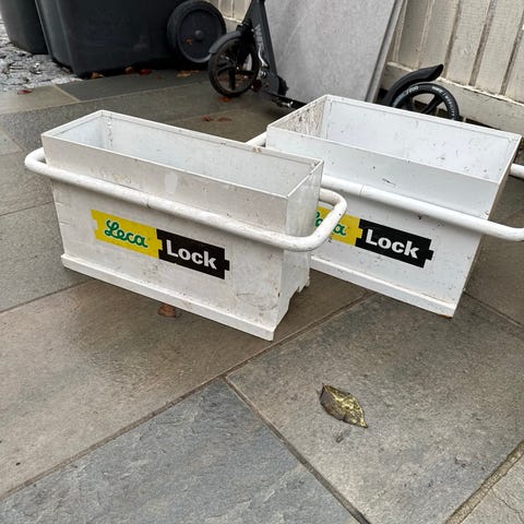 Leca Lock byggeform i stål med en lengde på 15 cm. Produktet er brukt og viser noe slitasje og rust. Egnet for bygging og støping av Leca-blokker.