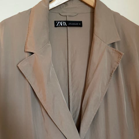 Nyrenset - Zara Trenchcoat i beige farge, størrelse M for kvinner. Jakken har et belte i midjen og klassisk trenchcoat-design med krage og knappelukking. Materialet er lett og egnet for overgangsvær. Ubetydelig brukt